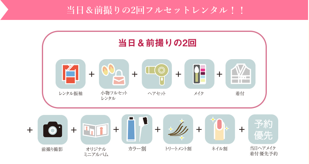 レンタル振袖、小物フルセットレンタル、ヘアセット、メイク、着付、